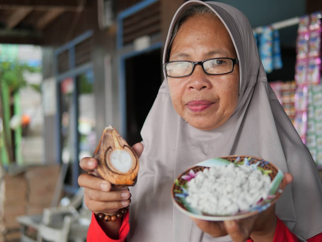Marwiyah, 40an tahun, sungguh perempuan inovatif. Di Sungai Beras, pesisir Jambi, tempatnya tinggal, pohon nipah berjajar memenuhi tepian sungai. Selama ini pohon dan buahnya terbuang begitu saja. ⠀
